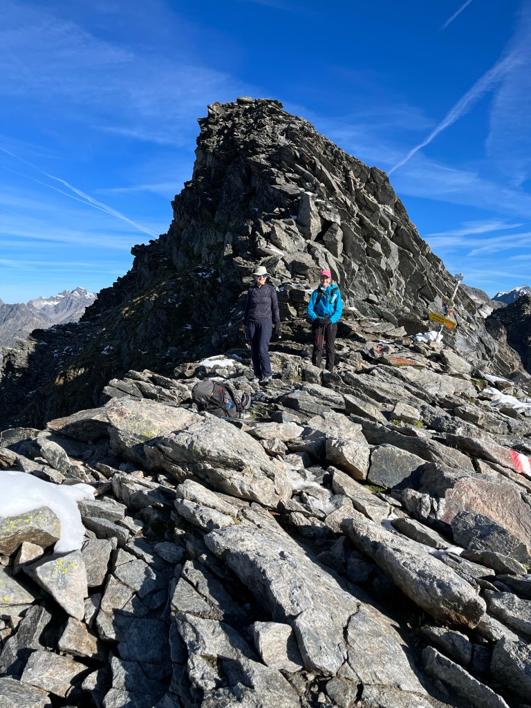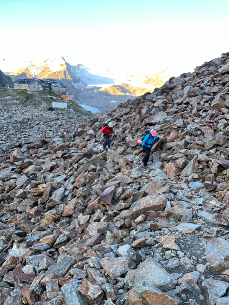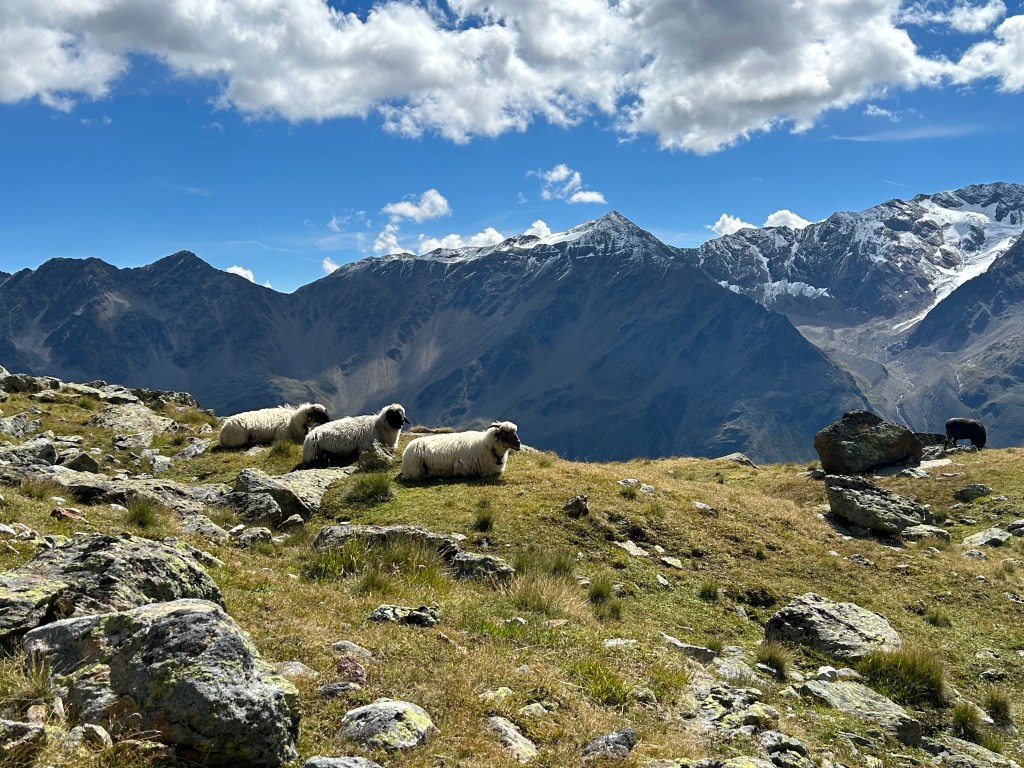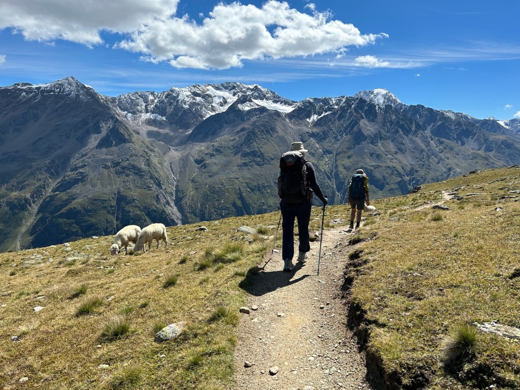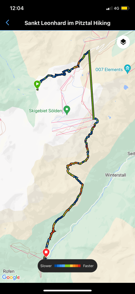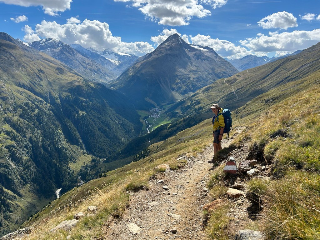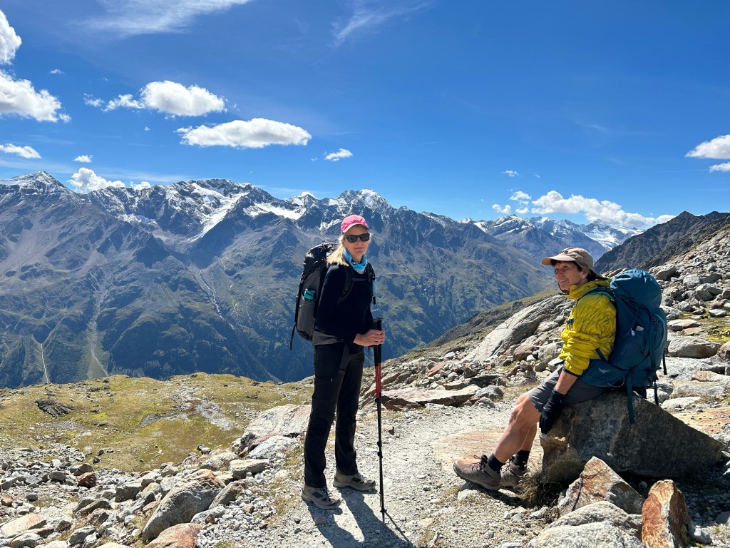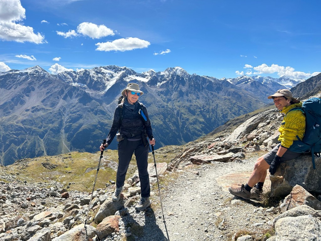 This hike took us up and over the Pitztaler Jöchl into the Ötztal Alps. We didn’t really want to hike this route but the less technical route was closed due to a blockage. The descent from the Pitztaler Jöchl at nearly 3000 meters was very challenging, involving steel ropes along a rock face where we had to choose our footing very carefully and use gloves to maintain a solid grip. This was a descent for the record books for us and required a measure of bravery and hoping for the best. Far below us was the town of Sölden. We had to take a regional bus through the Rosi-Mittelmaier Tunnel, through an otherwise impassable section, to the Rettenbach Glacier of the Ötztal Alps. From here we walked the Venter Panoramaweg, a high altitude route on which we were alone for 4 hours. We saw not a single sign and wondered if we were on the right path. There was no village in sight below. We were surrounded by glaciers ranging from 3600 to 3900 meters. We crossed several scree and boulder fields, making best efforts to do so as quickly as possible, though in a few spots going quickly was definitely not an option. The terrain was occasionally soft, yet extremely steep, requiring concentration with every step. Again, we had to dig deep to maintain our calm. Eventually we saw Vent. These destinations always look much closer than they are. We arrived with a feeling of great relief!