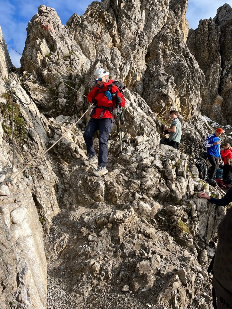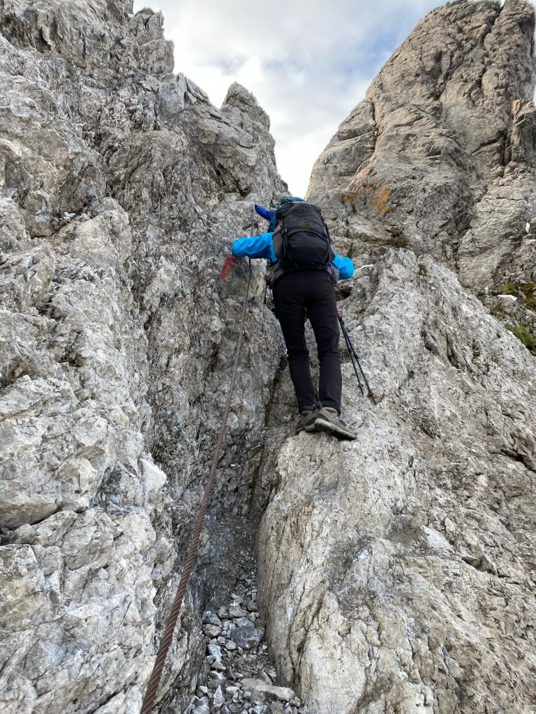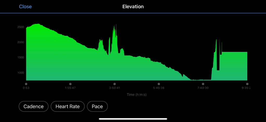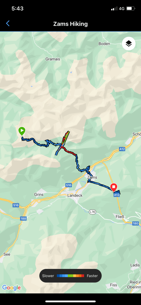 Today was quite a day. After a 6:45 departure from the hut we ascended a steep 500 meters. The elevation chart doesn’t quite show it because we forgot to start the GPS watch until almost at the top. Thereupon followed, dare we say, a challenging and occasionally harrowing descent of just shy of 2000 m. We all have stories for you for another time. Anyhow, descend we did for quite a few hours. When we thought we were close to Zams – we could see it – it took nearly 3 more hours to get there. We turned in at the Venet Gipfelhütte at the top of a mountain in Zams.