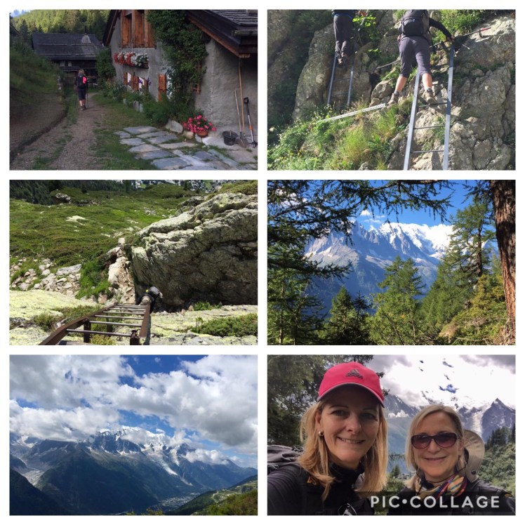 Booked: Les Chalets des Contamines FFCAM good (Federation Francaise des Clubs Alpins et de Montagne) 22 Route du Plan Du Moulin Alpes, Mont-Blanc; tel from abroad: +33 (0)4 50 47 00 88 (for us: 04 50 47 00 88) Use hotel card to take free bus to Les Houches. We found the wooden stairs start of the trail and resisted the temptation of taking the telepherique (cable car) up to Belleview to start our hike.